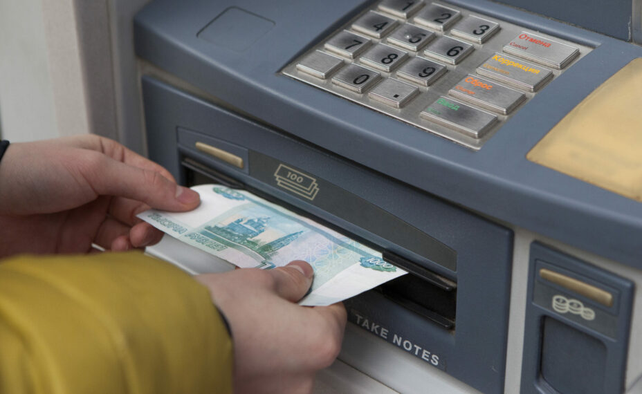 ×åëîâåê çàáèðàåò äåíüãè èç áàíêîìàòà.