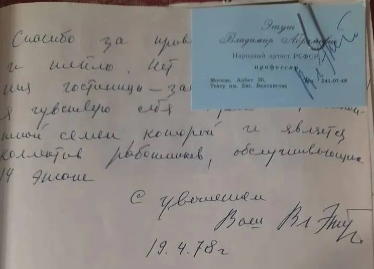 На предоставленных ростовчанином фото страниц с отзывами мы нашли комментарий и визитку народного артиста РСФСР Владимира Этуша. В донской гостинице советский и российский артист театра и кино, а также театральный педагог останавливался в апреле 1978 года.