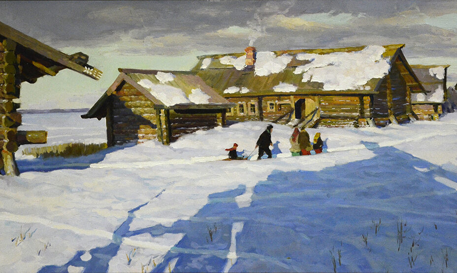 Художники пишут природу, которая именно в это время года бывает особенно нежной и хрупкой. В похожих мотивах Акименко В.И. «Зима. Солнечный день» и Мацкиева С.В. «Гости» солнечный свет заливает второй и дальний планы, придавая необычайную звучность краскам домов и деревьев на дальних планах. Пустота первого плана заставляет ощутить мягкость и воздушность снежного покрова. Само состояние природы создает разные настроения — от безудержной радости, до легкой грусти. 12+